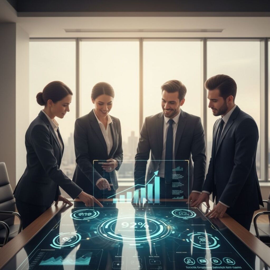 A diverse small business team reviews a digital human capital management dashboard with organizational charts and performance metrics in a collaborative office setting.
